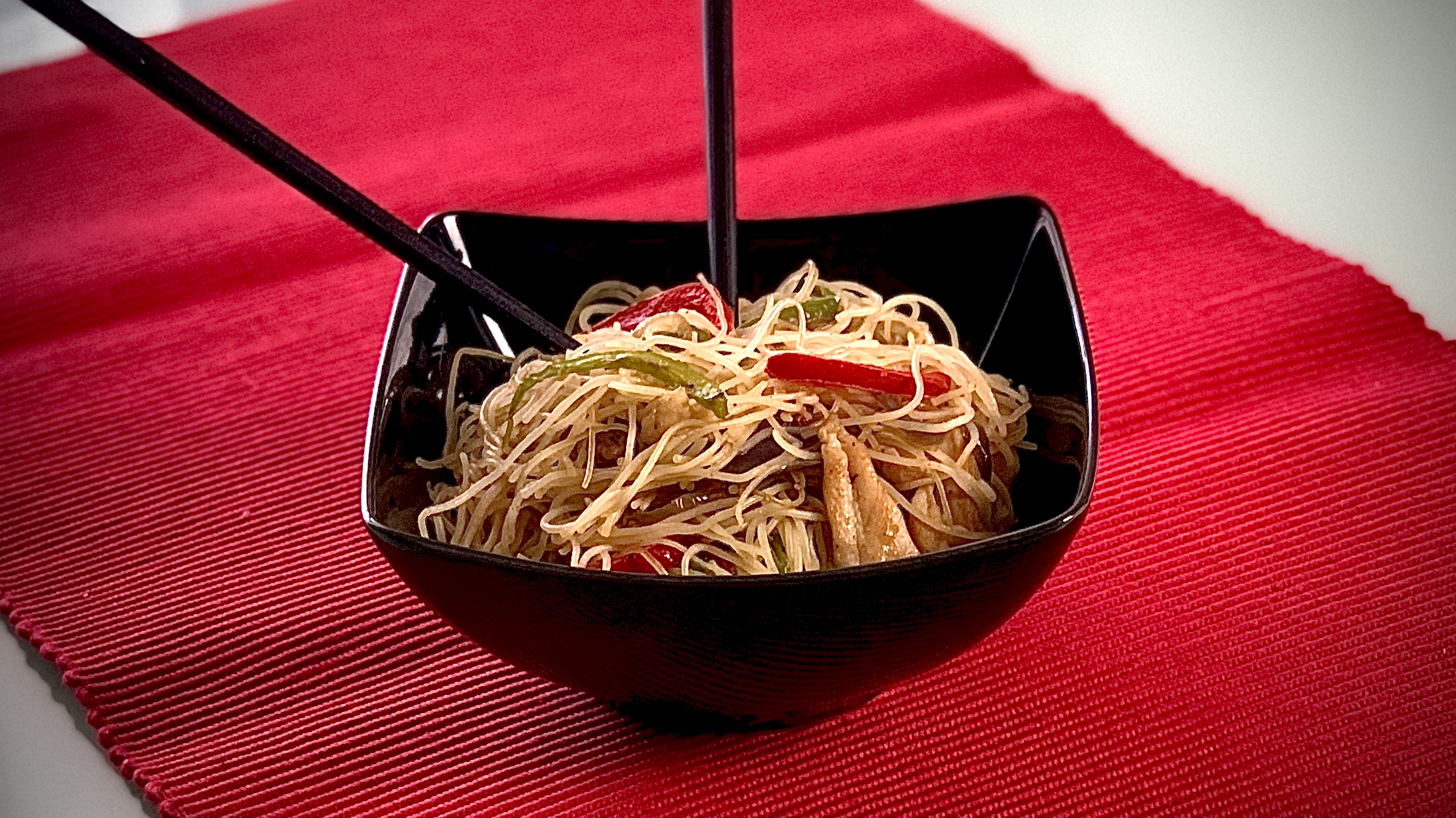 Fideos chinos de arroz con pollo y verduras